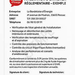 Entretien de climatisation – Air sain, performance garantie Chez La Bordelaise d’Énergie, nous vous aidons à respirer un air plus sain, prolonger la durée de vie de votre climatisation et réduire votre consommation d’énergie grâce à un entretien complet, réalisé par un professionnel certifié. L’intervention comprend : Unité intérieure : • Nettoyage et désinfection des filtres avec un fongicide professionnel (anti-allergènes et moisissures) • Traitement de l’évaporateur avec désinfectant QX-60® : 99,9 % des microbes éliminés • Réglage personnalisé des plages de température selon vos besoins Groupe extérieur : • Dépoussiérage et nettoyage du condenseur pour garantir un échange thermique optimal • Vérification des fixations, de l’état général et de l’encombrement (végétation, débris…) Contrôle technique complet : • Vérification du fluide frigorigène : contrôle de la pression, de la température et de l’étanchéité du circuit • Contrôle de la tension du compresseur • Recherche de signes de fuite ou de dysfonctionnement À l’issue de la visite : • Envoi par e-mail d’un compte rendu technique détaillé immédiatement • Facture transmise à la fin de l’intervention • Conseils personnalisés pour l’optimisation de votre installation Pourquoi faire appel à nous ? • Entreprise locale, réactive et notée 5/5 par ses clients • Interventions soignées avec matériel professionnel • Technicien expérimenté et certifié → Prenez rendez-vous dès aujourd’hui pour garantir confort, sécurité et longévité à votre climatisation !